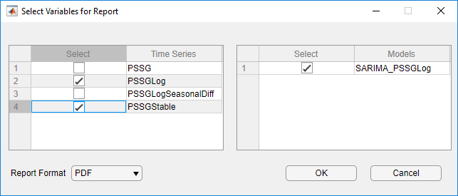 В диалоговом окне «Выбор переменных для отчета» установите флажки «Выбор» для PSSGLog и PSSGStable временные ряды и SARIMA_PSSGLog модель (при необходимости). Приложение автоматически устанавливает флажки для всех переменных, подсвеченных в областях Временные ряды и Модели.