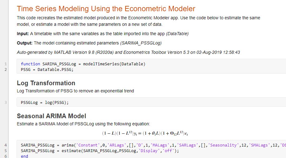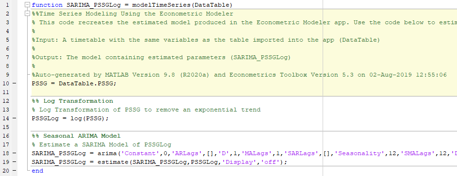 На вкладке Econometric Modeler в разделе Экспорт выберите Экспорт > Создать функцию. Откроется редактор MATLAB, содержащий функцию с именем modelTimeSeries. Функция принимает DataTable (переменная, импортированная в этом сеансе), преобразует данные и возвращает оценочную модель SARIMA (0,1,1) × (0,1,1) 12SARIMA_PSSGLog.