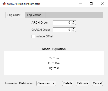 При корректировке значений параметров уравнение в разделе «Уравнение модели» изменяется в соответствии со спецификациями. Регулируемые параметры соответствуют аргументам пары «вход» и «имя-значение», описанным в предыдущих разделах и в garch справочная страница.