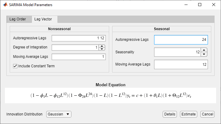 Аргумент пары имя-значение ARLags указывает запаздывание, соответствующее несезонному коэффициенту AR, (« SARLags определяет запаздывание, соответствующее сезонному коэффициенту AR, здесь при запаздывании 12. Несезонные и сезонные коэффициенты МА определяются аналогично. D определяет степень несезонного интегрирования. Seasonality определяет периодичность временного ряда, например, Seasonality = 12 - месячные данные. С тех пор Seasonality больше 0, степень сезонной интеграции равна единице.