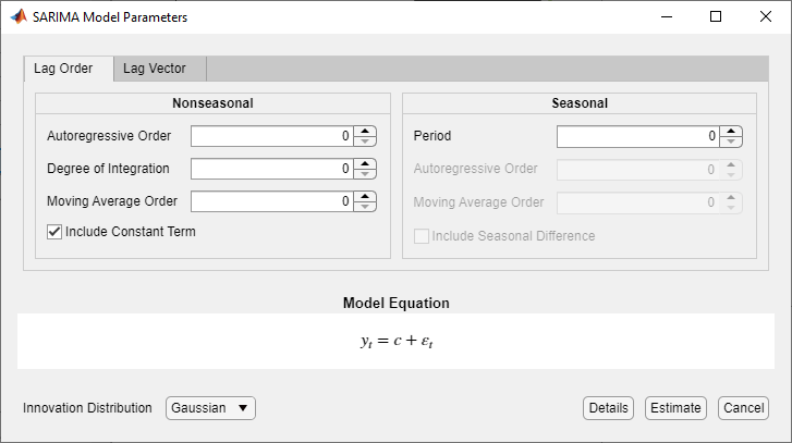 Чтобы исключить константу из модели и указать, что нововведения являются гауссовыми, выполните предыдущие шаги и снимите флажок Включить условие константы (Include Constant Term).