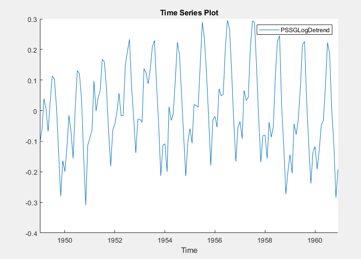 Преобразованная переменная PSSGLogDetrend появляется на панели Временной ряд (Time Series), а его график временных рядов появляется в окне рисунка Временной ряд (PSSGLogDetrend).