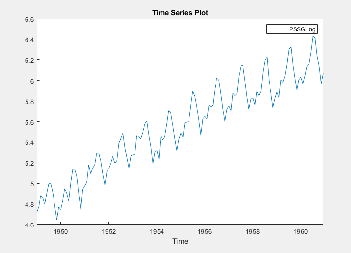 Преобразованная переменная PSSGLog появляется на панели Временной ряд (Time Series), а его график временных рядов появляется в окне рисунка Временной ряд (PSSGLog).