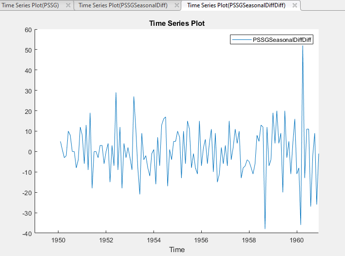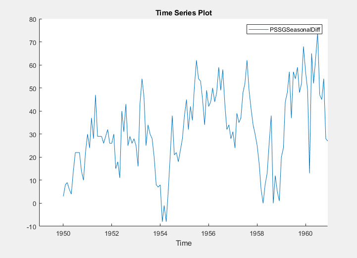 Устраните несезонный тренд, применив первое различие. С PSSGSeasonalDiff на панели Временной ряд (Time Series) на вкладке Эконометрический моделер (Econometric Modeler) в разделе Преобразования (Transforms) щелкните Разность (Difference).
