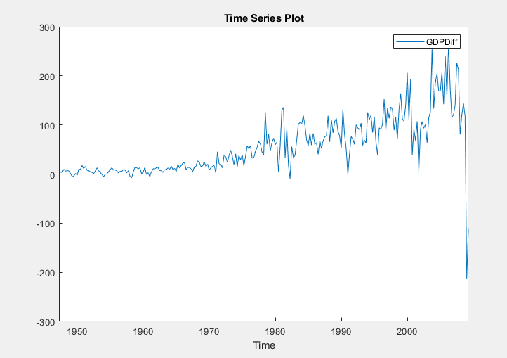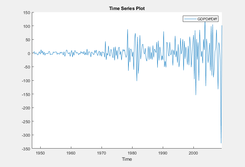 Применение второй разницы к ВВП путем дифференциации разностного ВВП. С GDPDiff на панели Временной ряд (Time Series) на вкладке Эконометрический моделер (Econometric Modeler) в разделе Преобразования (Transforms) щелкните Разность (Difference).