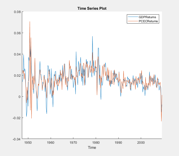 В этом примере показано, как преобразовать несколько серий цен в возврат. Набор данных, который хранится в Data_USEconModel.mat, содержит ВВП США и расходы на личное потребление, измеряемые ежеквартально, среди прочих рядов.