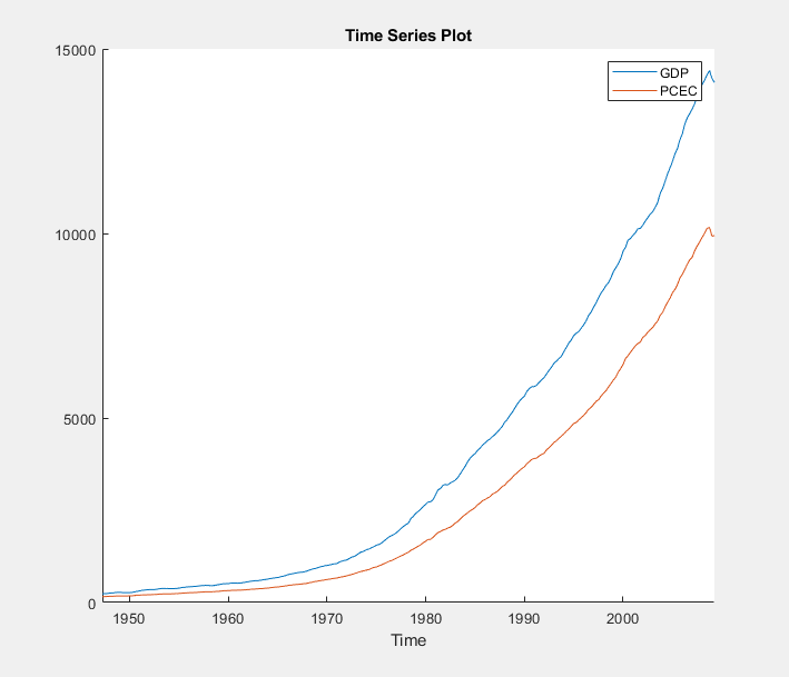 GDP и PCEC, среди прочих рядов, появляются на панели Временной ряд (Time Series), а график временных рядов, содержащий все ряды, появляется в окне рисунка.