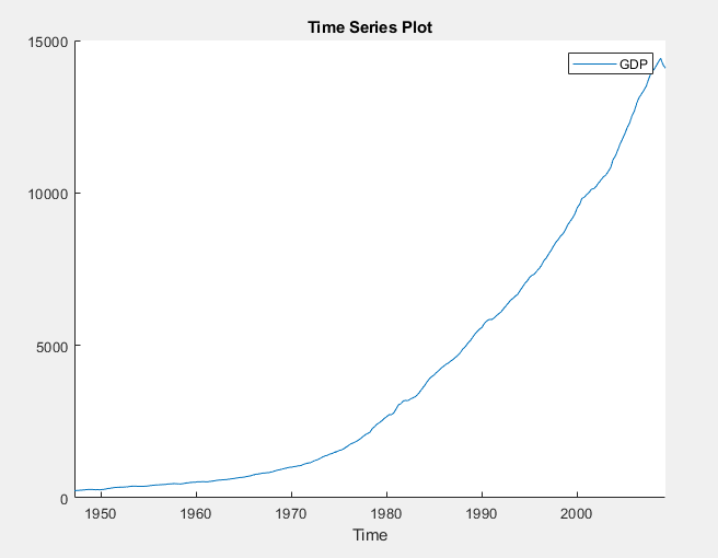 В этом примере показано, как стабилизировать временной ряд путем применения нескольких несезонных разностных операций. Набор данных, который хранится в Data_USEconModel.mat, содержит валовой внутренний продукт (ВВП) США, измеряемый ежеквартально, среди прочих рядов.