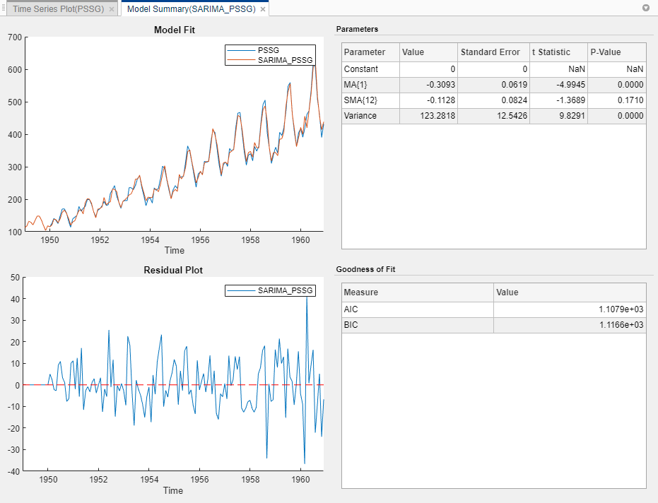 Переменная модели SARIMA_PSSG появляется на панели Модели (Models), его значение появляется на панели Предварительный просмотр (Preview), а его оценочная сводка появляется в документе Сводка модели (Model Summary (SARIMA_PSSG)).