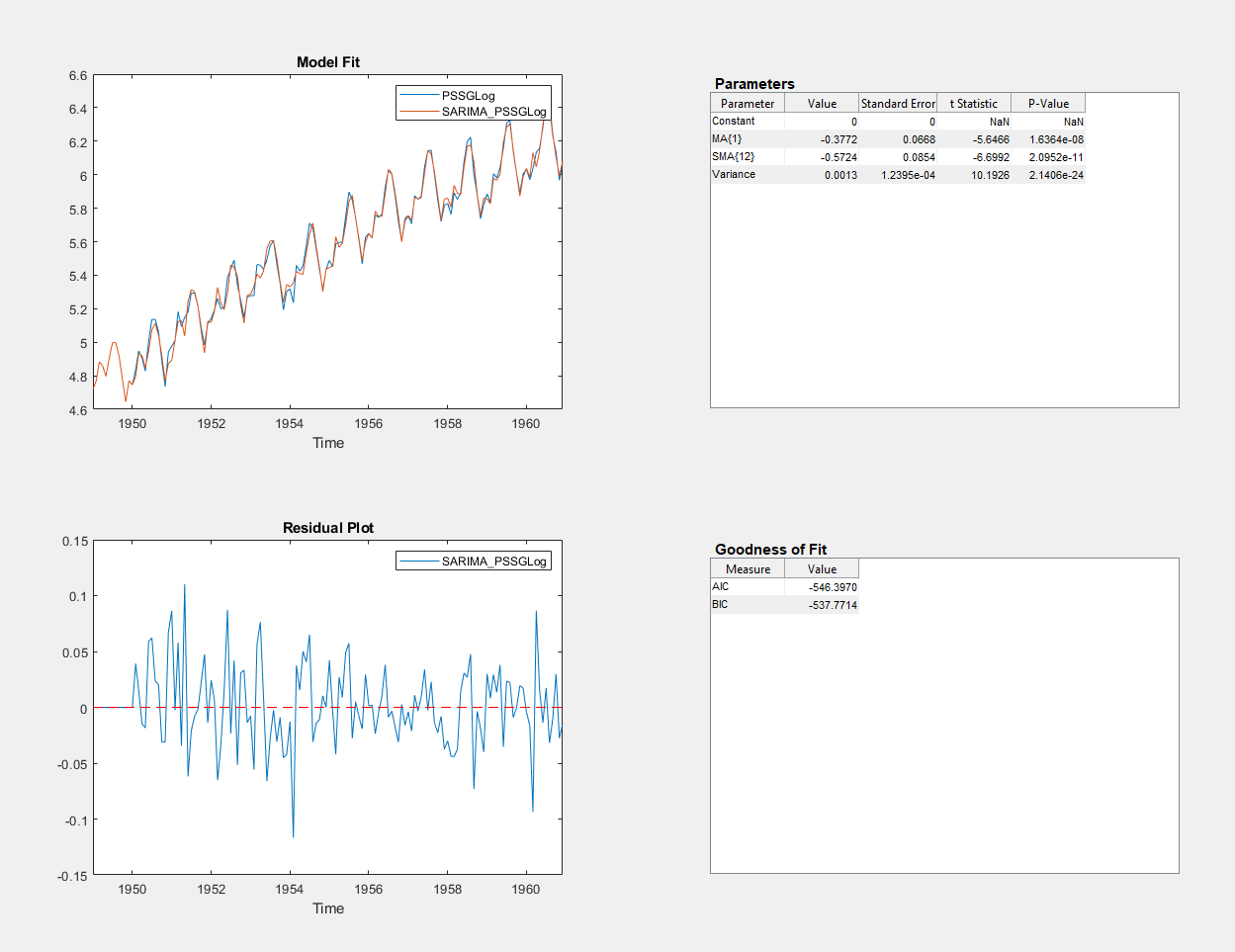 С PSSGLog на панели «Временные ряды» поместите модель SARIMA (0,1,1) × (0,1,1) 12 в записанную в журнал серию с помощью тех же параметров диалогового окна, которые использовались дляPSSG. Сводка по оценке появляется в документе «Сводка по модели» (SARIMA_PSSGLog).