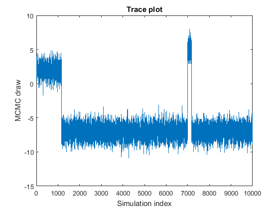 При рисовании образца MCMC рекомендуется рисовать более мелкую пилотную выборку, а затем просматривать графики трассировки значений нарисованных параметров, чтобы проверить, является ли образец адекватным. Графики трассировки - это графики значений нарисованных параметров относительно индекса моделирования. Удовлетворительный образец MCMC быстро достигает стационарного распределения и хорошо смешивается, то есть исследует распределение широкими шагами с небольшим или отсутствием памяти о предыдущем розыгрыше. Эта цифра является примером удовлетворительного образца MCMC.