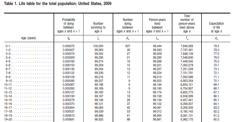 с radix l0 = 100000. Это число, lx, представляет количество людей из 100 000 при рождении, которые все еще живы в возрасте x.