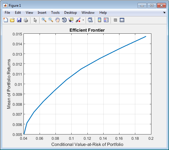 m = [ 0.05; 0.1; 0.12; 0.18 ]; C = [ 0.0064 0.00408 0.00192 0; 0.00408 0.0289 0.0204 0.0119; 0.00192 0.0204 0.0576 0.0336; 0 0.0119 0.0336 0.1225 ]; m = m/12; C = C/12; AssetScenarios = mvnrnd(m, C, 20000); p = PortfolioCVaR('scenario', AssetScenarios, 'lb', 0, 'budget', 1, 'plevel', 0.95); plotFrontier(p)