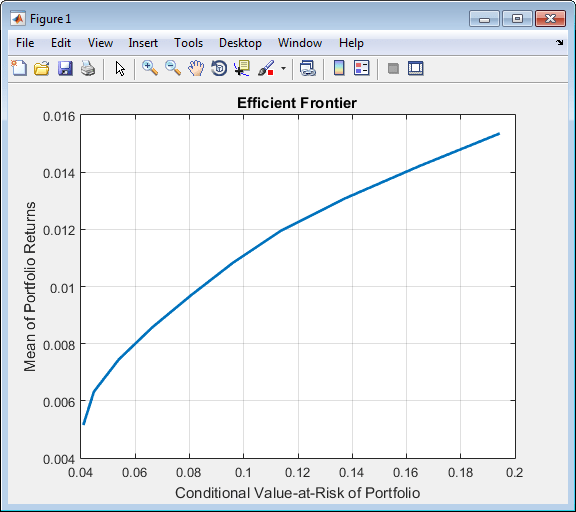 m = [ 0.05; 0.1; 0.12; 0.18 ]; C = [ 0.0064 0.00408 0.00192 0; 0.00408 0.0289 0.0204 0.0119; 0.00192 0.0204 0.0576 0.0336; 0 0.0119 0.0336 0.1225 ]; m = m/12; C = C/12; AssetScenarios = mvnrnd(m, C, 20000); p = PortfolioCVaR; p = setScenarios(p, AssetScenarios); p = PortfolioCVaR(p, 'LowerBound', 0); p = PortfolioCVaR(p, 'LowerBudget', 1, 'UpperBudget', 1); p = setProbabilityLevel(p, 0.95); plotFrontier(p)