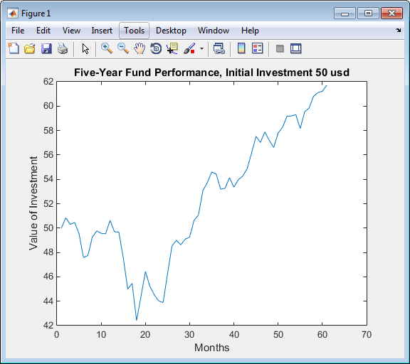 Fund50 = 50*TestData(:,1); plot(Fund50); title('\bfFive-Year Fund Performance, Initial Investment 50 usd'); xlabel('Months'); ylabel('Value of Investment');