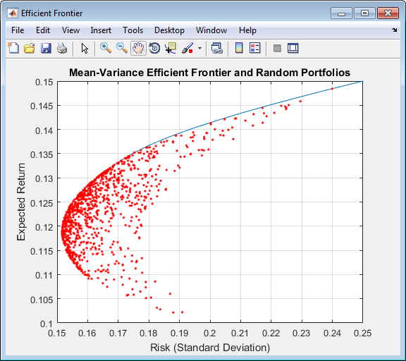 hold on plot (PortRisk, PortReturn, '.r') title('Mean-Variance Efficient Frontier and Random Portfolios') hold off