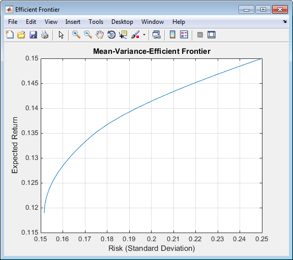 portoptВ этом примере показана эффективная граница гипотетического портфеля из трех активов. На ней показано, как определить ожидаемую доходность, стандартные отклонения и корреляции портфеля активов, как преобразовать стандартные отклонения и корреляции в ковариационную матрицу, а также как вычислить и построить график эффективной границы из матрицы доходности и ковариации. Пример также иллюстрирует, как случайным образом генерировать набор весов портфеля и как добавить случайные портфели к существующему графику для сравнения с эффективной границей.