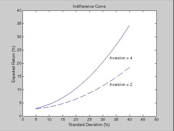 Одним из факторов, который следует учитывать при выборе оптимального портфеля для конкретного инвестора, является степень неприятия рисков. Этот уровень неприятия риска можно охарактеризовать, определив кривую безразличия инвестора. Эта кривая состоит из семейства пар риск/возврат, определяющих компромисс между ожидаемым возвратом и риском. Он устанавливает приращение взамен, которое требуется конкретному инвестору, чтобы сделать приращение риска стоящим. Типичные коэффициенты неприятия риска варьируются от 2,0 до 4,0, причем большее число представляет меньшую толерантность к риску. Уравнение, используемое для представления неприятия риска в программном обеспечении Financial Toolbox™,