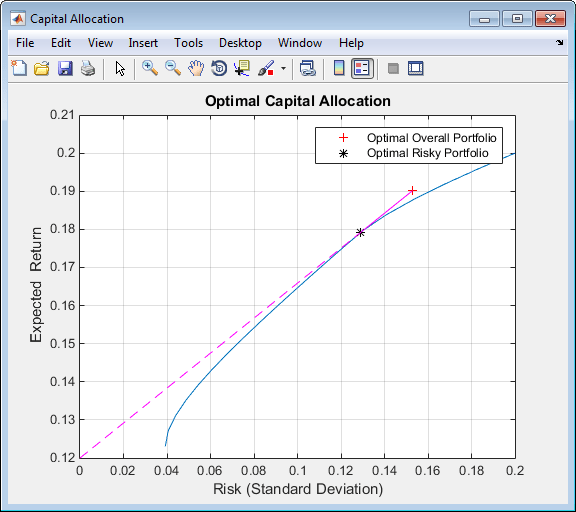 В этом примере оптимальный рискованный портфель рассчитывается на эффективной границе на основе безрисковой ставки, ставки заимствования и степени неприятия рисков инвестором. Это выполняется с помощью функции portalloc.