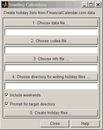 Нажмите Создать праздничные файлы для преобразования FinancialCalendar.com данные праздничных дней финансового центра в специфичные для рынка holidays.m файлы.