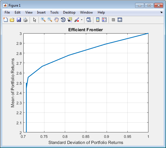 m = [ 1; 2; 3 ]; C = [ 1 1 0; 1 1 0; 0 0 1 ]; p = Portfolio; p = Portfolio(p, 'assetmean', m, 'assetcovar', C); p = Portfolio(p, 'lowerbudget', 1, 'upperbudget', 1); p = Portfolio(p, 'lowerbound', 0); plotFrontier(p)
