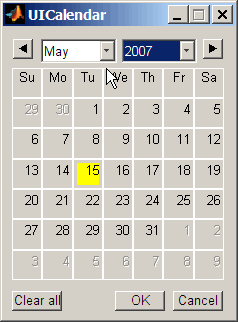 function pushbutton_cb(hcbo, eventStruct) % Create a UICALENDAR with the following properties: % 1) Highlight weekend dates. % 2) Only allow a single date to be selected at a time. % 3) Send the selected date to the edit box uicontrol. uicalendar('Weekend', [1 0 0 0 0 0 1], ... 'SelectionType', 1, ... 'DestinationUI', dateEditBoxHandle); end end