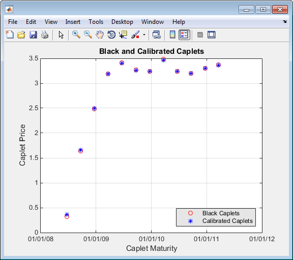 OptimCaplets = Caplets+OptimOut.residual; disp(' '); disp(' Black76 Calibrated Caplets'); disp([Caplets OptimCaplets]) plot(MarketMatNum(2:end), Caplets, 'or', MarketMatNum(2:end), OptimCaplets, '*b'); datetick('x', 2) xlabel('Caplet Maturity'); ylabel('Caplet Price'); title('Black and Calibrated Caplets'); h = legend('Black Caplets', 'Calibrated Caplets'); set(h, 'color', [0.9 0.9 0.9]); set(h, 'Location', 'SouthEast'); set(gcf, 'NumberTitle', 'off') grid on