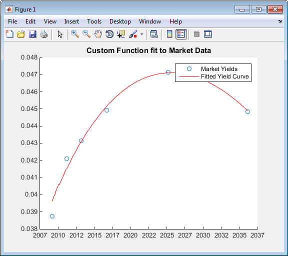 Yields = bndyield(CleanPrice,CouponRate,Settle(1),Maturity); scatter(Maturity,Yields); PlottingPoints = min(Maturity):30:max(Maturity); hold on; plot(PlottingPoints, getParYields(CustomModel, PlottingPoints),'r'); datetick legend('Market Yields','Fitted Yield Curve') title('Custom Function fit to Market Data')