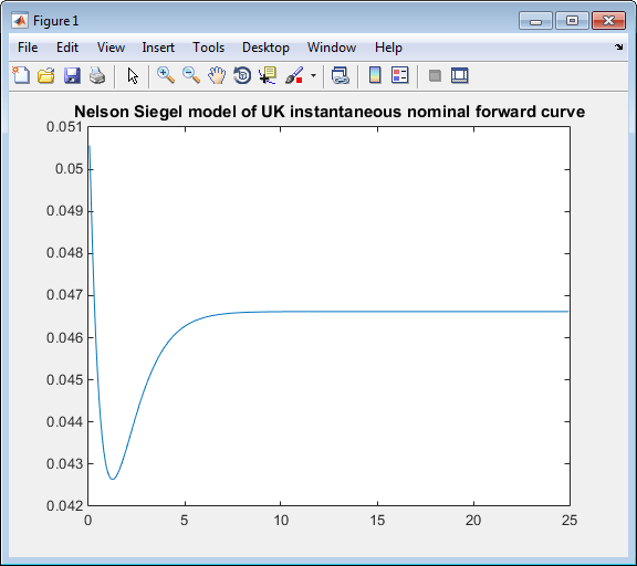 NSModel = IRFunctionCurve.fitNelsonSiegel('Zero',CurveSettle,... Instruments,'Compounding',-1,'InstrumentPeriod',InstrumentPeriod);