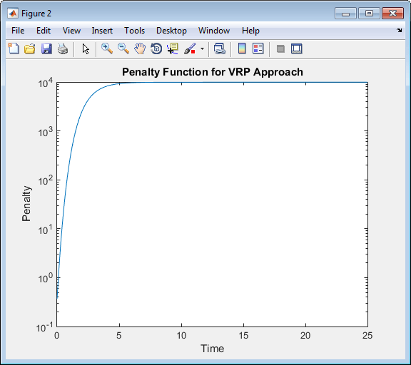 lambdafun = @(t) exp(L - (L-S)*exp(-t/mu)); t = 0:.1:25; y = lambdafun(t); figure semilogy(t,y); title('Penalty Function for VRP Approach') ylabel('Penalty') xlabel('Time')