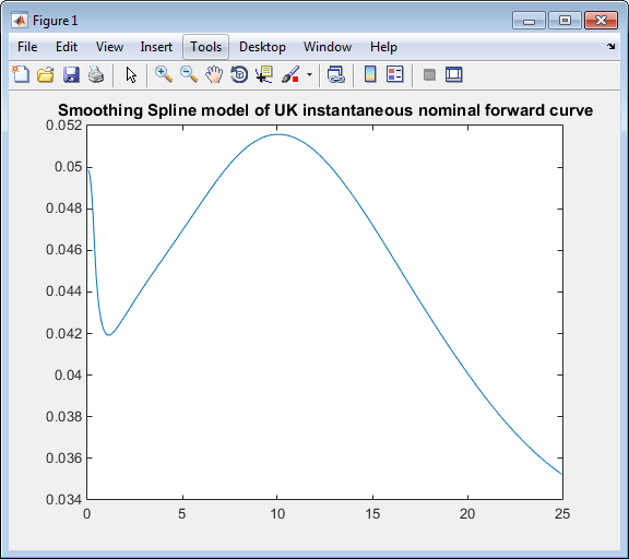 VRPModel = IRFunctionCurve.fitSmoothingSpline('Forward',CurveSettle,... Instruments,lambdafun,'Compounding',-1, 'InstrumentPeriod',InstrumentPeriod);