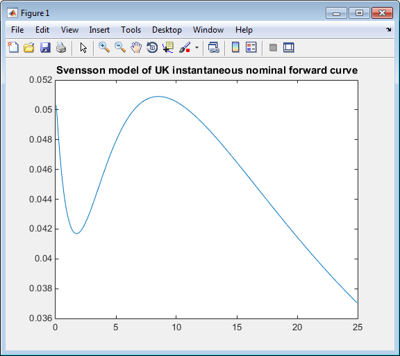 SvenssonModel = IRFunctionCurve.fitSvensson('Zero',CurveSettle,... Instruments,'IRFitOptions', fIRFitOptions, 'Compounding',-1,... 'InstrumentPeriod',InstrumentPeriod)