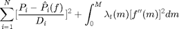 где первый член является разницей между наблюдаемой ценой P и прогнозируемой ценой ^, (взвешенной по длительности связи, D), суммированной по всем связям в нашем наборе данных, а второй член является штрафным членом (где λ - штрафная функция, а f - сплайн).
