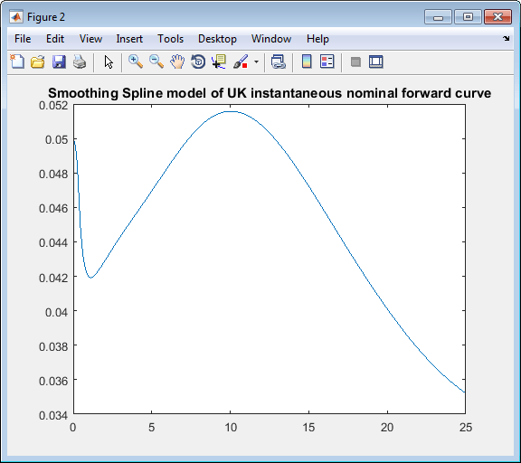 Fcurve = IRFunctionCurve.fitSmoothingSpline(Type, Settle, Instruments, Lambdafun,Name,Value) подгоняет сглаживающий сплайн к рыночным данным для облигации. Необходимо ввести необязательные аргументы для Basis, Compounding, и Knots как пары, разделенные запятыми Name,Value аргументы. Name является именем аргумента и Value - соответствующее значение. Name должен отображаться внутри кавычек. Можно указать несколько аргументов пары имен и значений в любом порядке как Name1,Value1,...,NameN,ValueN.