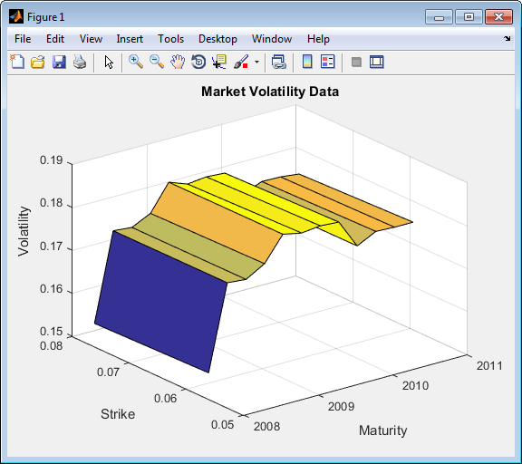 [AllMaturities,AllStrikes] = meshgrid(MarketMaturity,MarketStrike); figure; surf(AllMaturities,AllStrikes,MarketVolaltility) datetick xlabel('Maturity') ylabel('Strike') zlabel('Volatility') title('Market Volatility Data')