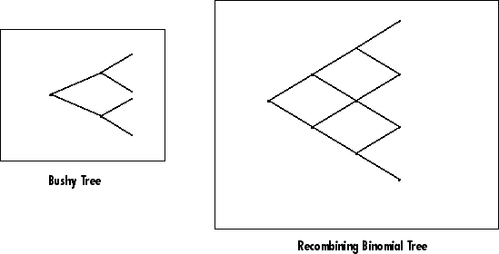 Деревья инструментов Financial Instruments Toolbox могут быть классифицированы как bushy или рекомбинирующие. Кустарниковое дерево - дерево, в котором количество ветвей увеличивается экспоненциально относительно времени наблюдения; ветви никогда не рекомбинируются. В этом контексте рекомбинирующее дерево является противоположностью кустарниковому дереву. Рекомбинирующее дерево имеет ветви, которые рекомбинируют с течением времени. Из любого данного узла узел, достигаемый путем перемещения вверх-вниз, является тем же самым узлом, достигаемым путем перемещения вниз-вверх. Далее иллюстрируются бушное дерево и рекомбинирующее биномиальное дерево.