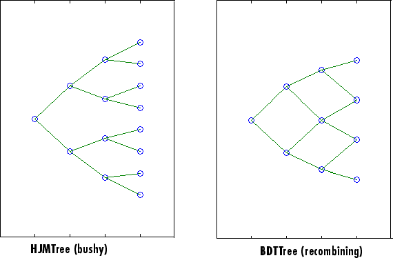 Модель Хит-Джарроу-Мортона работает с кустарниковыми деревьями. Модель Black-Derman-Toy, с другой стороны, работает с рекомбинацией биномиальных деревьев. Модели процентных ставок Халл-Уайт и Блэк-Карасинск работают с рекомбинированием триномиальных деревьев.