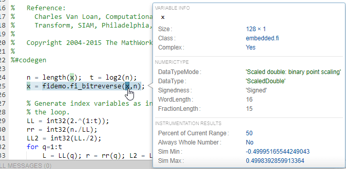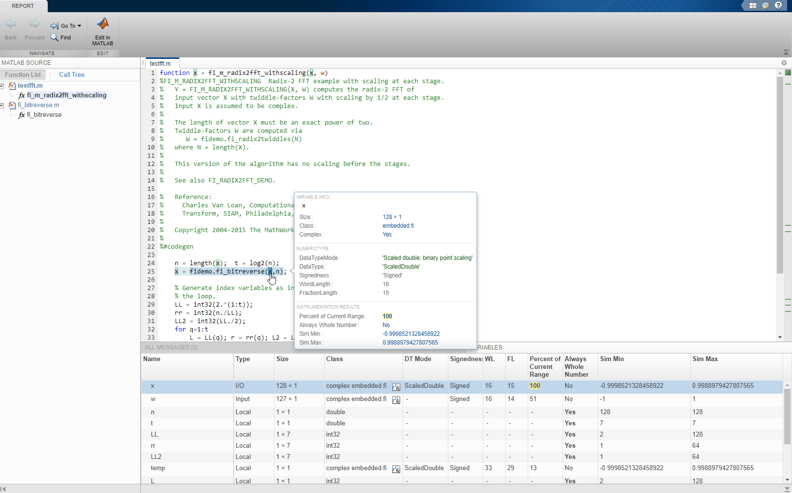 buildInstrumentedMex testfft -o testfft_instrumented -args {x,W}Запустите испытательный стенд для регистрации результатов измерений. Звонить showInstrumentationResults для открытия отчета. Просмотрите минимальное и максимальное значения моделирования и состояние целого номера, приостановив работу над переменной в отчете.