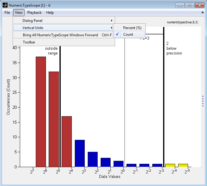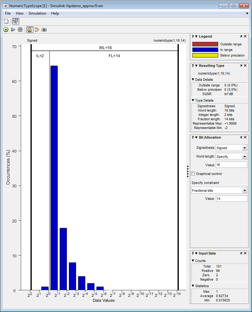 NumericTypeScope - это объект, предоставляющий информацию о динамическом диапазоне данных. Область предоставляет визуальное представление динамического диапазона данных в виде log2 гистограмма. В этой гистограмме веса битов отображаются вдоль оси X, а процент вхождений - вдоль оси Y. Каждый элемент гистограммы соответствует биту в двоичном слове. Например, 20 соответствует первому целому биту в двоичном слове, 2-1 соответствует первому дробному биту в двоичном слове.