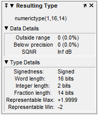 В разделе «Сведения о данных» отображается процент значений, выходящих за пределы диапазона или ниже точности, с помощью numerictype объект, расположенный в верхней части этой панели. SQNR (отношение шумов квантования сигнала) изменяется в зависимости от сигнала. Если параметр не имеет значения, то для вычисления SQNR недостаточно данных. Когда информация о области или numerictype изменяет, SQNR сбрасывается.