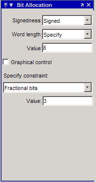 На панели «Результирующий тип» описывается тип данных с фиксированной точкой, определенный параметрами области. Манипулируя визуальным дисплеем (с помощью панели Bit Allocation или курсоров) можно изменить значение типа данных.