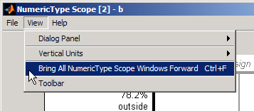 NumericScopeType Графический интерфейс пользователя предлагает пункт меню View > Bring All NumericType Scopes Forward, чтобы помочь в управлении NumericTypeScope окна. Выбор этой опции или нажатие клавиш Ctrl + F приводит ко всемNumericTypeScope окна в вид. Если NumericTypeScope в настоящее время окно не открыто, эта опция меню открывает окно и выводит его на экран.