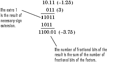 Умножение чисел двух с фиксированной точкой дополнения прямо аналогично регулярному десятичному умножению, за исключением того, что промежуточные результаты должны быть расширены так, чтобы их левые стороны выровнялись, прежде чем сложить их вместе.
