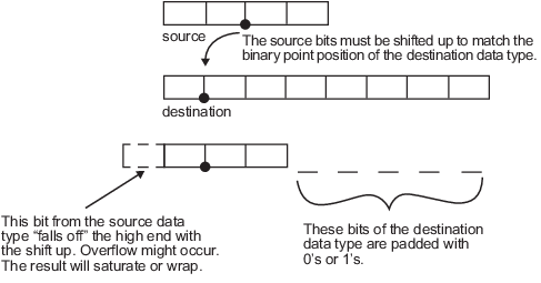 Как показано на диаграмме, исходные биты сдвигаются вверх так, чтобы двоичная точка соответствовала позиции целевой двоичной точки. Высший исходный бит не подходит, поэтому может произойти переполнение и результат может насытиться или обернуться. Пустые биты на нижнем конце типа данных назначения дополняются либо 0, либо 1: