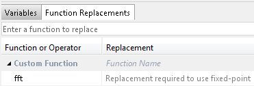 Приложение помечает неподдерживаемые вызовы функций, обнаруженные в алгоритме на вкладке Замены функций. Например, при использовании fft функция, которая не поддерживается для фиксированной точки, инструмент добавляет запись в таблицу на этой вкладке и указывает, что необходимо указать функцию замены, которая будет использоваться для операций с фиксированной точкой.