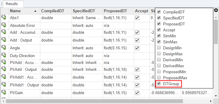Объекты модели, использующие один и тот же объект данных для указания его типа, должны иметь один и тот же тип данных. Инструмент «Фиксированная точка» собирает диапазоны для всех объектов модели. Объекты, которые должны совместно использовать один и тот же тип данных, помещаются в группу типов данных. Инструмент «Фиксированная точка» создает предложение по типу данных для группы на основе объединения диапазонов всех объектов модели в группе.