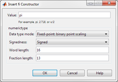 При работе с файлами в MATLAB ® можно создать fi конструкторы объектов с помощью диалогового окна Вставить конструктор fi. После указания значения и свойств fi в диалоговом окне можно вставить предварительно заполненный fi конструктора объекта в определенном расположении в файле.