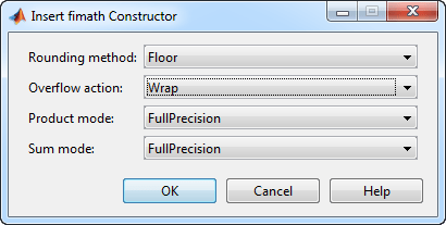 При работе с файлами в MATLAB ® можно создать fimath конструкторы объектов с помощью диалогового окна «Вставить конструктор fimath». После указания свойств fimath в диалоговом окне можно вставить предварительно заполненный fimath конструктора объекта в определенном расположении в файле.