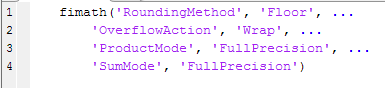 Арифметические атрибуты fi определяются локальным fimath объект, который присоединен к этому fi объект. Если fi объект не имеет локального fimathиспользуются следующие значения fimath по умолчанию: