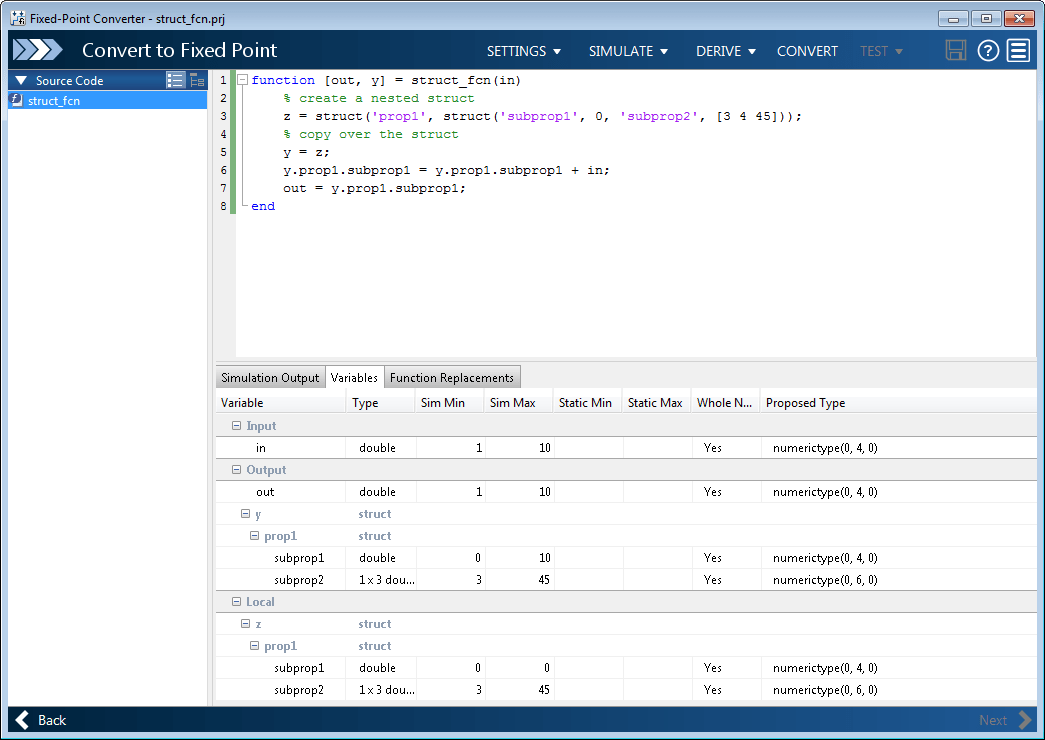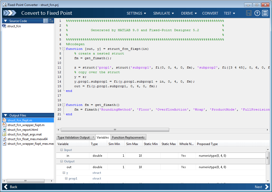 Преобразователь фиксированной точки преобразует функцию, содержащую структуры, в фиксированную точку и генерирует struct_fcn_fixpt.m файл.